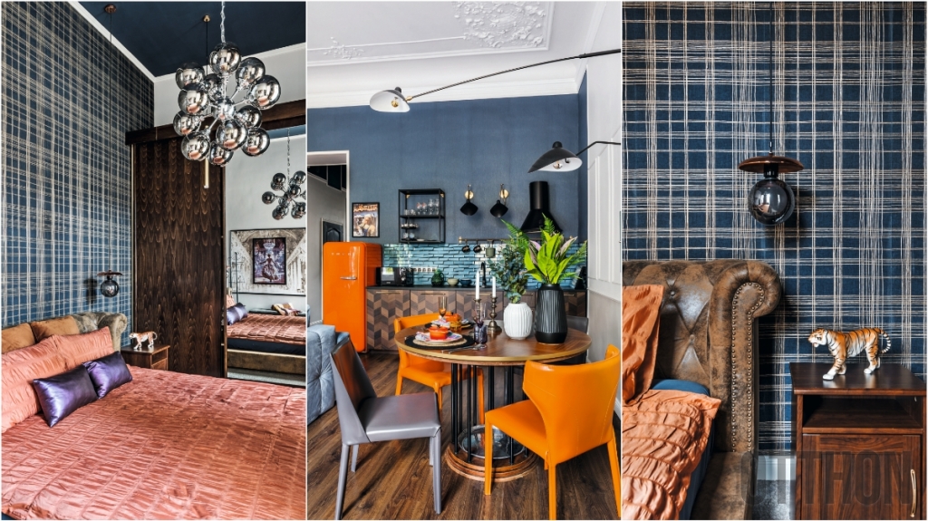 „Amint beléptem, szinte láttam magam előtt a szürkéskék árnyalatokat. Ezért került az ablakkal szemben lévő, természetes fénnyel megvilágított falra a sötét tapéta, és a bútorok között is megjelenik a kék mindenféle árnyalata” – mondja a lakberendező a többi térben is visszaköszönő színről, amit szinte mindenütt különféle barna tónusok egészítenek ki.