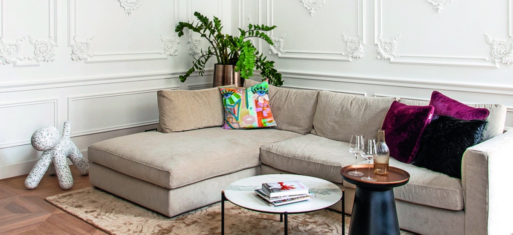 „Lenyűgözött a belmagasság és a tágas terek kínálta lehetőség. El tudtam képzelni benne a védjegyemmé vált gipszstukkókat éppúgy, ahogy a modern bútorokat és a korszerű megoldásokat” – kezdi Róbert a ma már elegáns eklektikát sugárzó otthon történetét.