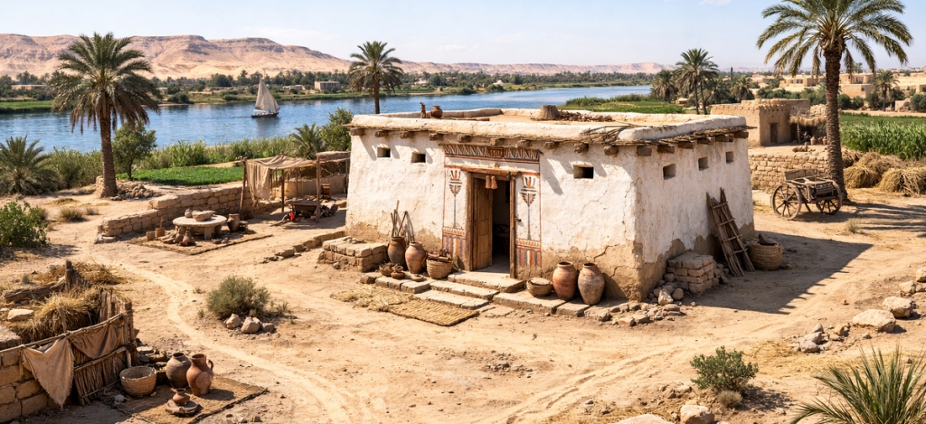 Az ókori egyiptomi házak legfontosabb építőanyaga a Nílus partjáról származó iszapból készült vályogtégla volt, amelyet szalmával kevertek össze és a napon szárítottak meg. Ez az anyag rendkívül jó hőszigetelő, így a belső terek még a legnagyobb forróság idején is viszonylag hűvösek maradtak. A falakat többnyire fehérre meszelték, hogy visszaverjék a napfényt, az ablakokat pedig minél magasabban igyekeztek elhelyezni, hogy csak a fény jusson be a lakásba, a hő ne. Ezek a házak általában téglalap alakúak voltak, lapos tetővel, utóbbi fontos élettérként szolgált. Az emberek sokszor itt aludtak a forró nyári éjszakákon és itt szárították az élelmiszereket is.