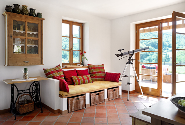 „A lenti részt úgy terveztük, hogy két embernek kényelmes otthon lehessen. Nem nagy, eltúlzott termeket akartunk, inkább praktikus, jól használható helyiségeket." Térnek ott a táj, ami minden pillanatban más arcát mutatja, ezért áll a hatalmas távcső is a kanapé sarkában, amit Panni lányuk kapott valamelyik évben karácsonyra. Az épített kanapét szintén Zoltán készítette felesége instrukciói alapján.