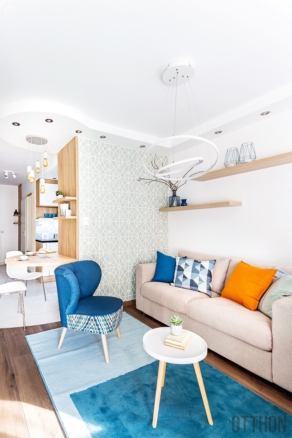 A terveket szemlélve Istvánt meglepte, milyen ügyesen elhatárolhatók a funkciók falak felhúzása nélkül is. „Nagyon tetszettek az ötletek, így belevágtunk a munkába. Végül csak a fürdőszoba maradt zárható helyiségben, minden mást összenyitottunk.” Arra azonban ügyeltek, hogy mindennek meglegyen a helye. Az U alakú konyha organikus folytatása egy kiforduló falpanel, amellyel kijelölték az étkező helyét. A félköríves asztal nem csupán kevesebb helyet foglal, de biztonságosabb is: egy kis lakásban jó kerülni az éles sarkokat. Az asztal ívét követi a mennyezeti gipszkartonozás és a beépített világítás, ez pedig egyszerre összekapcsolja és finoman szeparálja a teret.