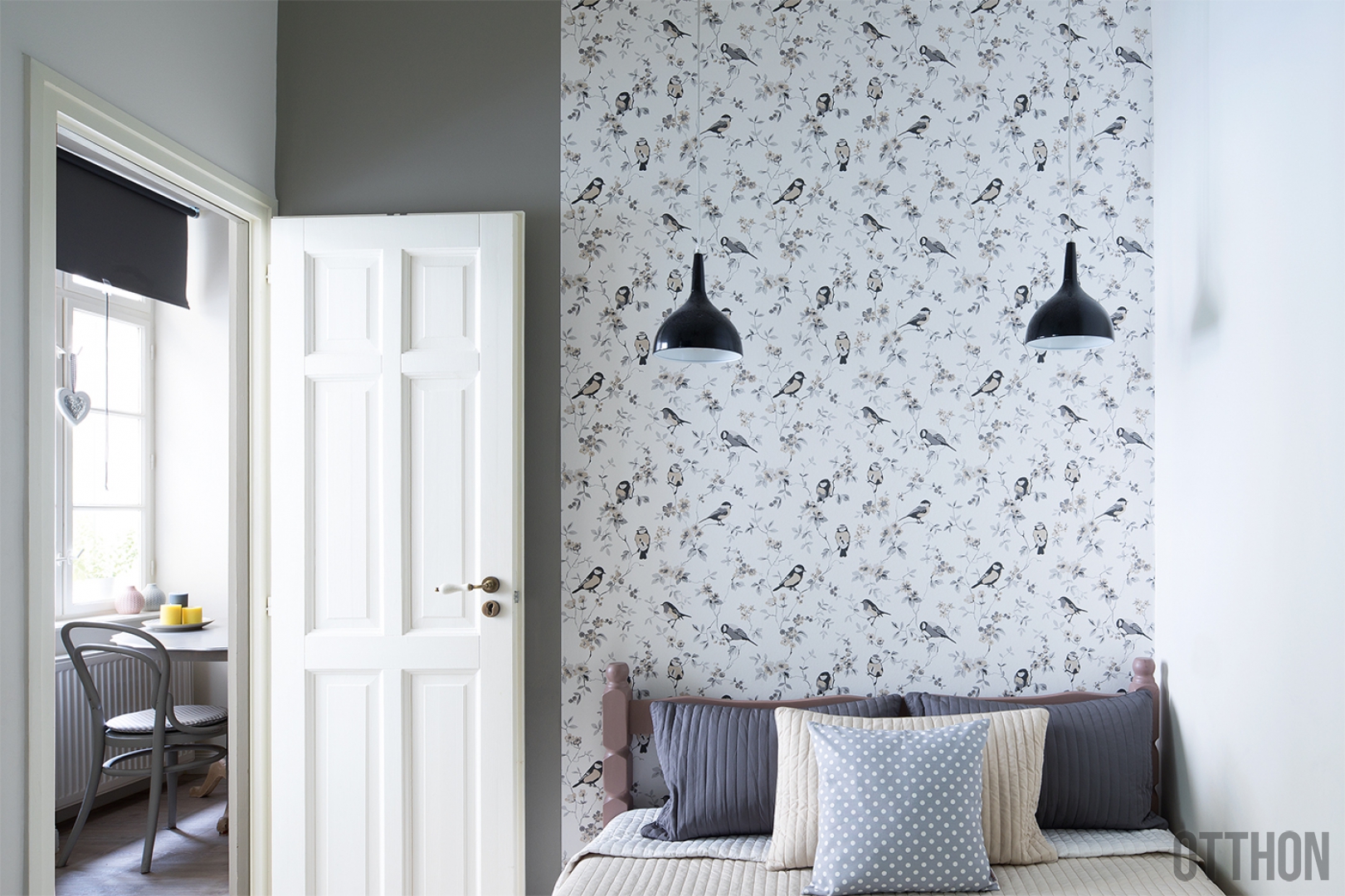 A világosszürkére és ekrüre festett falak remekül tágítják a teret, ám a tulajdonos és a leendő bérlő is szerette volna, ha a természetet is be tudják csempészni a lakásba. A növényminták mellett a madármotívumokra esett a választás, hiszen az épület Budapest egyik zöld szigete közelében áll. „Kétségkívül a hálószoba tapétája az egyik legfeltűnőbb darab, de a kanapé feletti vászonkép is vonzza a tekintetet. A díszpárnák textiljét együtt választottuk, ezen szintén megjelennek a természet ihlette, romantikus minták.” Ennek a bájos lakásnak épp ebben a finomságban rejlik az ereje. A szürke és fehér mellé ugyanis jó ízléssel társították a meleg okkersárga és a kék árnyalatait, a kedves, de nem hivalkodóan nőies kiegészítők pedig barátságossá teszik a kislakást.