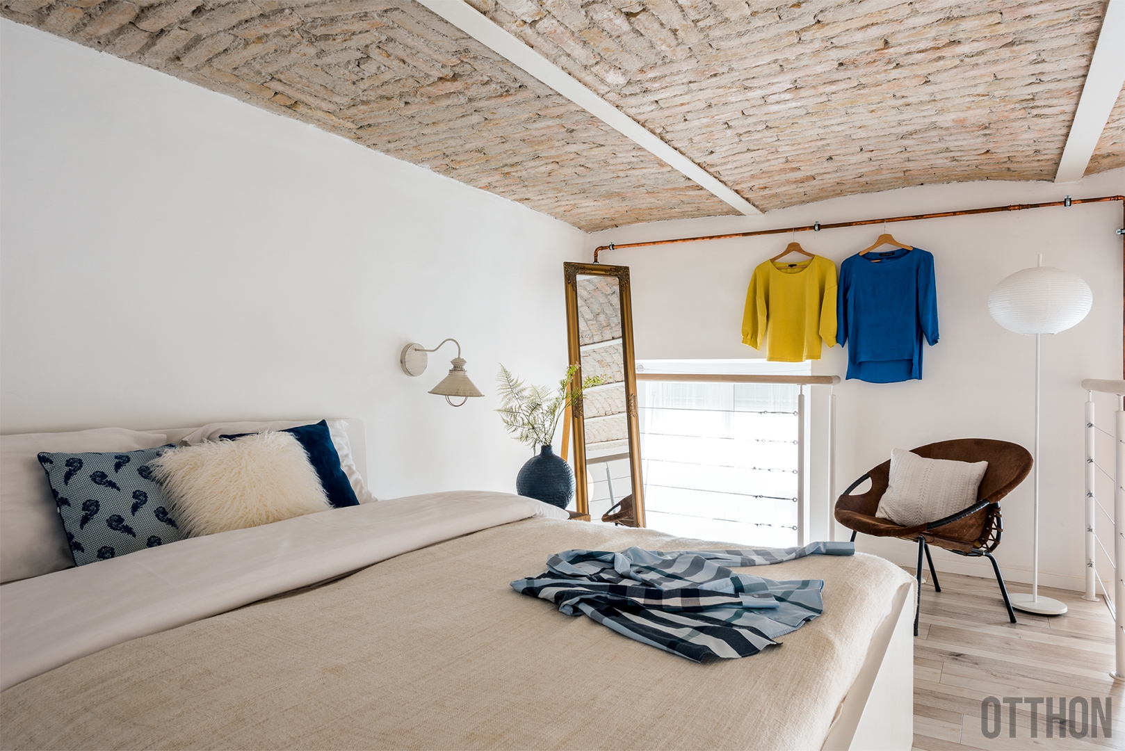 A berendezéskor fontos cél volt, hogy a kellemes térérzet ne menjen a praktikum rovására. Ennek érdekében a lépcső alatti teret teljes egészében hasznosították: polcos részekből áll, illetve itt rejtették el a bojlert és a háztartási eszközöket is. A konyhában nincs felső szekrény, de az U alakú kialakítás elegendő tárolóhelyet biztosít, és egy étkezőpult is kapcsolódik hozzá. A tágasság érzetét fokozza, hogy a lakás uralkodó színe a fehér, amit a piros székek, valamint a központi helyre függesztett festmény keltenek életre. A költségek csökkentése miatt ugyan laminált padlót és cementlap hatású csempét fektettek le, de ahol csak lehetett, igyekeztek természetes anyagokat választani. Ezt képviseli a marhabőr szőnyeg, a régi Chesterfield kanapé, és legfőképp a boltozatos téglamennyezet, amitől Adriennek olyan érzése van, mintha egy miniloftban élne.