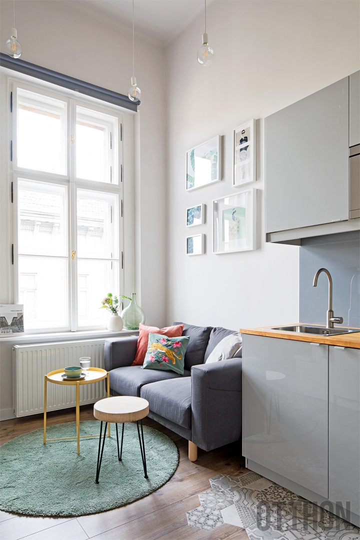 Egy ilyen kicsi lakásnál a bútorok megtervezése központi kérdés, hiszen a szabványméretek sokszor nem megfelelőek, ráadásul minden pici tér értékes.