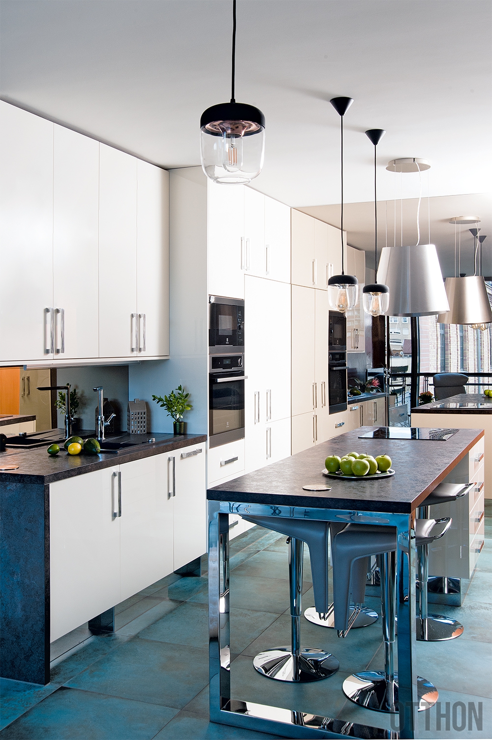 Jimnek azonnal szimpatikus volt az ötlet, hogy ha már belevágunk a felújításba, akkor minden színvonalas minőségben készüljön. Azt reméltük, hogy ezzel a potenciális bérlők körét is komolyan meghatározzuk.” Mivel az épület indusztriális hangulatú, ezért a belső kialakításnál is ebben a stílusban gondolkoztak. Mindehhez az alapot a kékeszöld, rozsdapatinás burkolólap teremtette meg, amely színével kicsit a Dunát idézi, ráadásul az ipari hangulathoz is passzol. Végül a hálószobán kívül mindenhová ez a burkolat került, még a teraszra is, sőt a fürdőszoba falára is felfuttatták a nagyméretű lapokat.