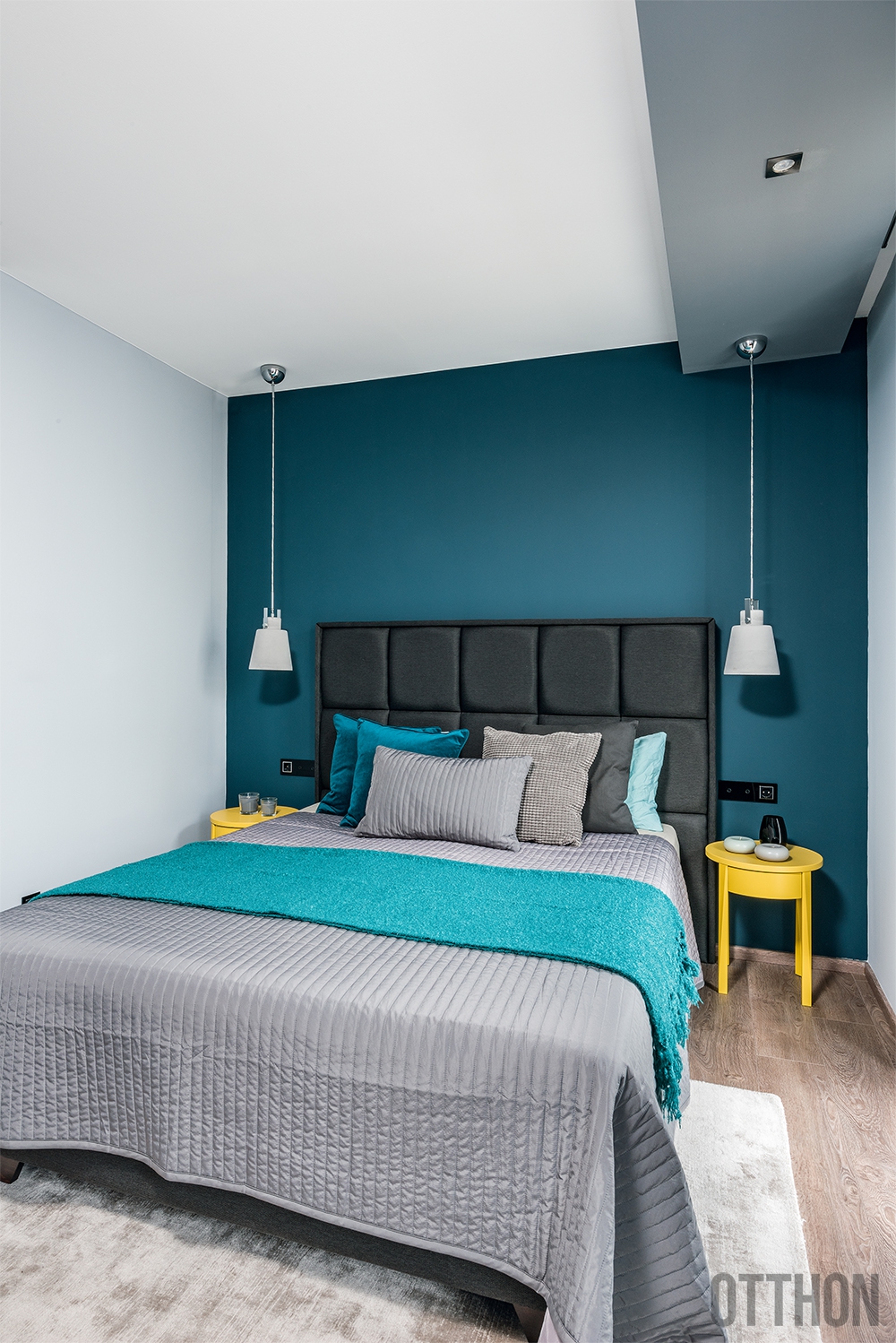 A minimal design István kérésére kellemes, férfias színekkel és a zsúfoltságot kerülő bútorozással valósult meg. „A déli fekvésnek köszönhetően a lakás elég világos, ezért bátran dönthettünk erős, meghatározó színek mellett” – mondja Loydl Péter, aki a Benjamin Moore festékekkel a falakat is a design részévé tette. Praktikus oka is volt ennek, mivel az újépítésű házban – az esetleges épületmozgás miatt – nem lett volna szerencsés a tapéta használata. A szürke tónus végigvonul a helyiségeken, csupán a hálószoba egyik fala visel indigókék színt, ami díszpárnák, vázák és kisebb dekortárgyak formájában a lakás több pontján is visszaköszön. Igaz ez a designkörökben szívesen alkalmazott rose gold megjelenítésére is, amit elsősorban a függesztékek képviselnek, és játékos fémes csillogásukkal erősítik István stílusos otthonát.
