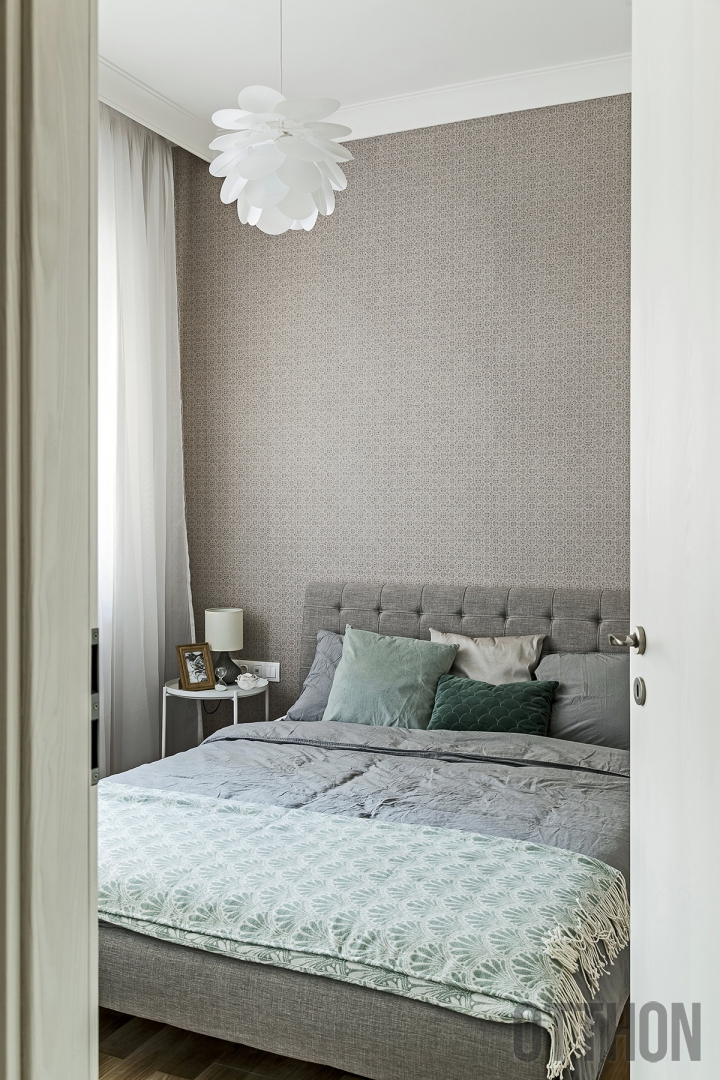 A szoba-konyhás lakásban nem kellett falat bontani, viszont a funkciókat átszervezték: a nappali, az étkező és a konyha egy helyiségbe került, míg az egykori konyha-étkező zárható hálószoba lett. „Csupán főbb vonalakat adtunk meg az átalakításhoz, egyébként a tervezőkre bíztuk magunkat. Meleg, otthonos tereket álmodtunk meg, ahol egyszerre jelenhetnek meg a nőies és a férfias hangulatú elemek, hogy valóban mindketten jól érezzük magunkat” – mondta Bernadett. A közösségi tér színes textiljeivel és látványos pálmafamintás tapétájával friss, vidám, lágy összhatást kelt, míg a hálószoba színvilágát visszafogottabbra, kissé férfiasabbra hangolták, akárcsak a fürdőszobát. Az egyik legnagyobb kihívás éppen ez volt: a kis helyen óvatosan kellett adagolni a színeket, a textúrákat, hogy végül kialakuljon a tökéletes egyensúly.