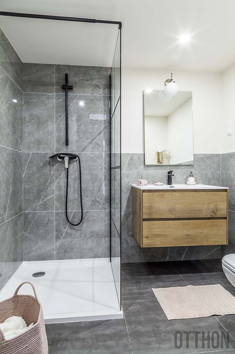„A virágmintás tapétaajtó nagyon jó megoldásnak bizonyult, teljesen észrevétlen. Mögötte bújik meg a fürdőszoba, ami a lakás egyetlen fallal leválasztott helyisége” – mutatott körbe Marcsi az immár szellős közösségi helyiségen. A tágas érzetet tovább fokozza, hogy az étkező- és nappalirészt még burkolatváltás sem választja el, míg a megmaradt galériát hálóként hasznosították. Hihetetlen, de a pici fürdőben eredetileg szinte az egész helyiséget betöltő sarokkád állt, de az új zuhanyfülke mellé kényelmesen befért egy nagyobb mosdó és a törülközőszárító radiátor is.