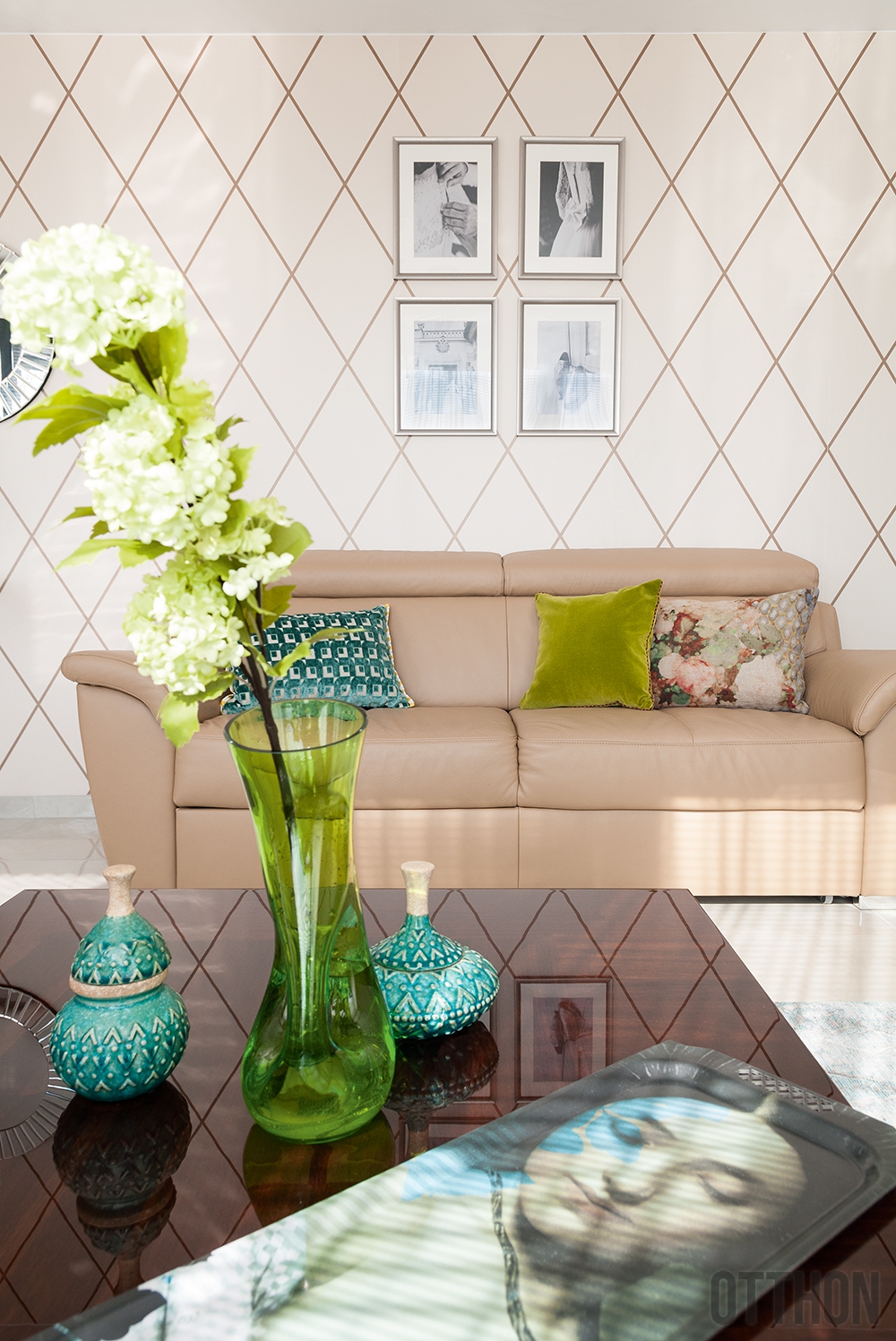 Ami pedig a stílust illeti, Elizáék visszafogott színekre, könnyed, mégis izgalmas és otthonos környezetre vágytak. A színpalettáról a barna egészen finom, pasztell tónusait választották, berendezés tekintetében pedig modern darabokat kerestek. „Érdekes módon kettőnk közül Omar a romantikusabb alkat, én a letisztultabb dolgokat kedvelem, de az a kiegyensúlyozottság és elegancia, amit a bézs képvisel, számára is könnyen elfogadható volt. Omarnak tulajdonképpen egyetlen határozott kérése volt, egy saját dolgozószoba.” Az alaphangulatot így a pasztell harmóniája teremti meg a lakásban, amire rájátszanak a finom art deco hatású, modern bútorok a nappaliban. Éppen ezt a klasszikus, mégis mai életérzést keresték – szellős berendezéssel, zsúfoltság nélkül, sok szép részlettel. Utóbbit képviseli a nappali geometrikus tapétája és néhány ezüstösen csillogó kiegészítő is, amelyek szinte szikráznak a napfényben. Fényből is jut bőven a lakásba, hiszen a közösségi tér egyik falát majd kilenc méter hosszan üvegfelület borítja. A négyzetméterektől független nagyvonalúságról és kifinomultságról egyetlen egy helyiségben sem mondtak le – ez teszi igazán különlegessé Elizáék otthonát.