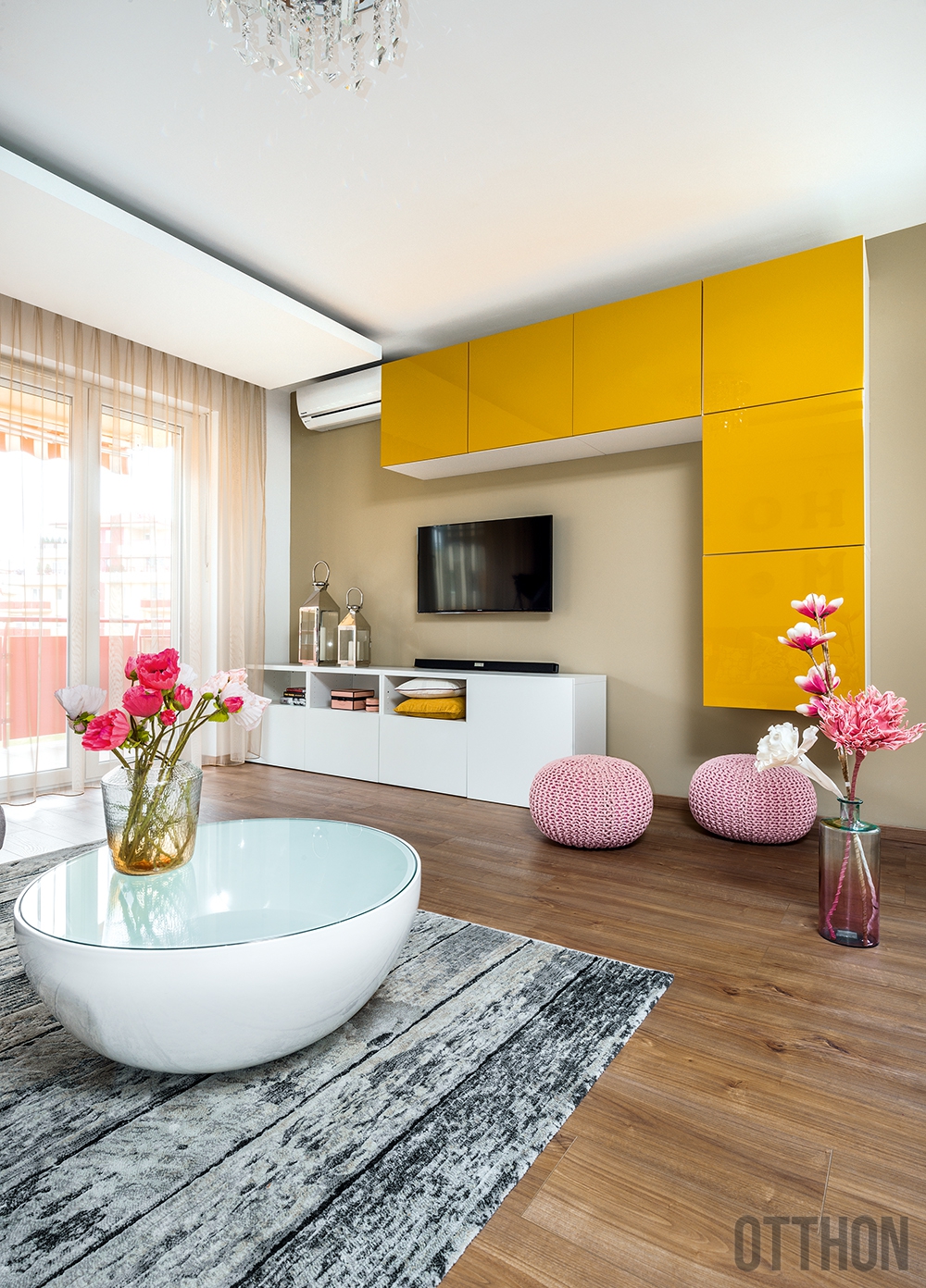 Ebből a finom tone-in-tone hatásból szinte kivilágítanak a tévét keretező, fordított L alakú felsőszekrények magasfényű, élénksárga frontjai. Emellett lágyítják az összképet a díszpárnákon és a tapétán megjelenő virágminták, illetve a lekerekített formák is: a jópofa rózsaszín puffok és a fehér, tojásdad alakú dohányzóasztal. Alul fa hatású, felül törtfehér ajtókkal készült a konyhabútor, melyet hófehér, egyszerű vonalvezetésű étkezőasztal egészít ki. A hozzá rendelt átlátszó plexiszékeknek köszönhetően nemcsak tágasabbnak tűnik a tér, de a különleges, virágokra emlékeztető függőlámpák is nagyobb hangsúlyt kapnak. A lámpák mellett a kreatív megoldások is egyedi megjelenést adnak a lakásnak. Ilyen a nappali falán található, hatszögletű elemekből álló tükörkompozíció, és vagány, nőies hatást keltenek a rendhagyó módon vállfákra akasztott képek is az előtérben.