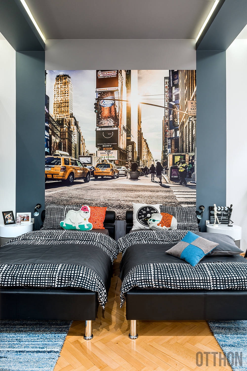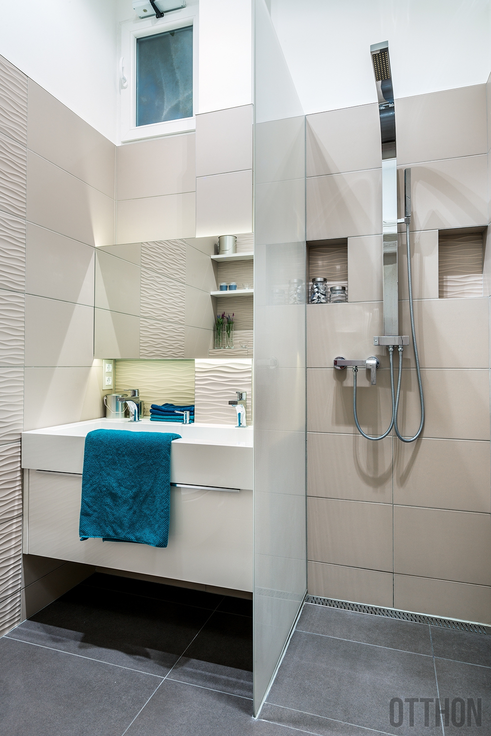 A fürdőszobákba háromdimenziós, hullámsávos csempét választottak Máriáék, hogy megtörjék a síkokat, és mozgalmasabb legyen az összhatás. Az izgalmas, egyedi és modern burkolatok mellett helyenként azért megőrizték az eredeti parkettát. „Mivel a gyerekeink már tinédzserek, meg aztán egy nyüzsgő nagyváros közepén élünk, szerettem volna az indusztriális stílust is megjeleníteni az otthonunkban” – mutatja Mária a lakás több pontján is feltűnő ipari hatású lámpákat és függesztékeket. De a tárolás is a legfőbb szempontok között szerepelt. „Szeretem, ha mindennek megvan a helye, és nem vágyom rá, hogy túlzottan szem előtt legyenek a dolgaink. Ezért több gardróbot is elhelyeztünk a lakásban.” Mária otthona akár a bemutatóterme is lehetne, hiszen többnyire saját tervezésű és gyártású bútorokkal rendezte be a helyiségeket, hogy otthonos