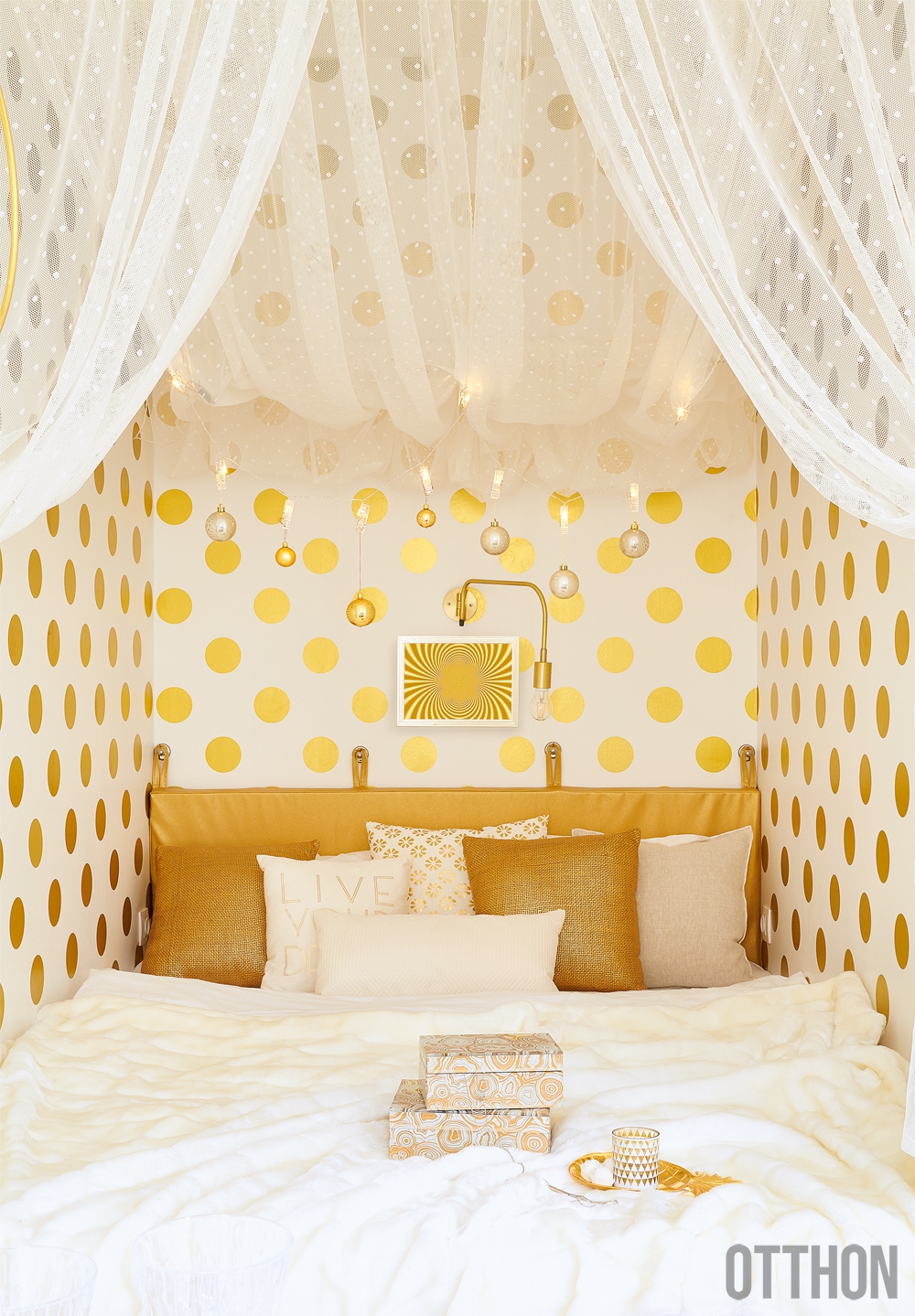 „Rengeteg pöttyös ruhám van, nagyon szeretem ezt a mintát, és amikor megláttam az arany pöttyös tapétát, eldőlt, hogy ez fogja meghatározni az enteriőr hangulatát. Természetesen nem terveztük ezzel beborítani az összes falat, arra viszont tökéletes, hogy a nappali és a hálórészt hangsúlyozzuk és csillogóvá tegyük vele.” Fanni és Atilla semmiképpen nem akart fallal, ajtóval leválasztott hálófülkét, ám mégis valami módon személyessé kívánták tenni a fekhelyet. Az épített hálófülkét habkönnyű függönnyel választották le, ami megvalósította a házigazda gyermekkori álmát: egy baldachinos ágyat. „Nagyon szeretek itt bekuckózva olvasni, vagy éppen a laptopon dolgozni, ami lehet, hogy meglepő, de szintén aranyszínű” – árulja el Fanni, aki bár az ünnepeket nem a lakásban, hanem a családdal, a Balaton mellett tölti, de itt is karácsonyi hangulatot teremt minden évben. Arról nem beszélve, hogy ide tér vissza egy-egy ajándékbeszerző túráról, és itt csomagolja az ajándékokat, így a hároméves Lili és húga, Emma sem neszeli meg, mi várja majd őket a fa alatt szenteste.