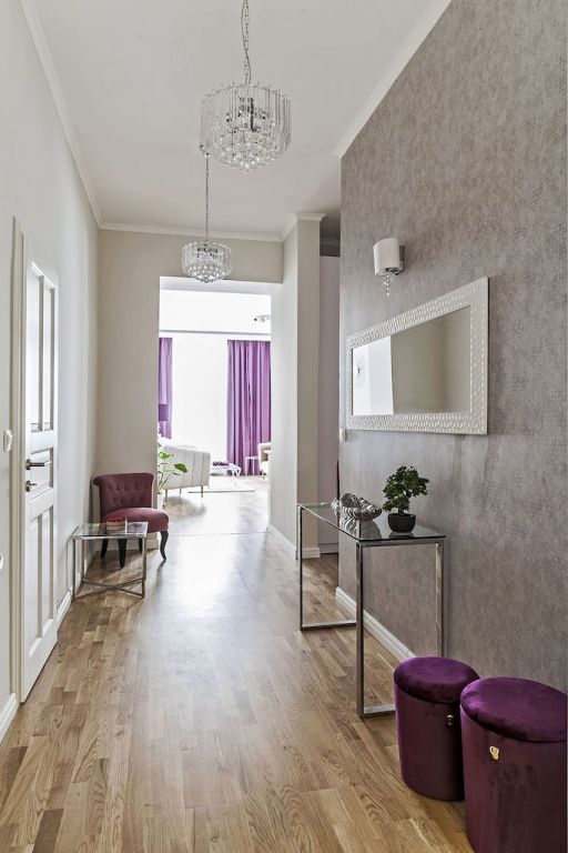 A lépcsőházból a tágas előszobába lépünk, ahonnan előre pillantva felsejlik az erős padlizsán szín a nappaliban. Ám közben nem lehet nem észrevenni a minőségi tapétát, amely tökétesen illeszkedik a nagypolgári lakás hangulatához. A felújításkor külön helyiséget készítettek a mosógépnek, a negyedik hálószoba pedig egy külön fürdőszobát is kapott okosan beosztott gardróbszekrénnyel.