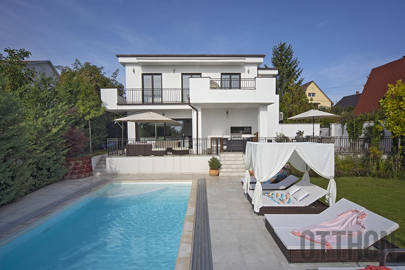 A maximális kikapcsolódást szolgáló hangulat az emeleten is folytatódik; semmilyen felesleges tárgy nem zavarja a felhőtlen pihenést, és szinte minden hálószobához saját erkély kapcsolódik. Innen a szülők jól belátják a teljes kertet, amelyet ők alakítottak át. Olyan jól sikerült az áttervezés, hogy ha éppen nem az ellenáramoltatós medencében róják a hosszokat, vagy a sekélyebb gyerekrészben pancsolnak, biztos, hogy valamelyik kültéri pihenőrészen töltik a nap nagy részét. Merthogy azokból is van választék: fedett balkon, nyitott étkezős terasz, klasszikus napozó- és keleties hangulatú baldachinos ágy várja őket. Utóbbi sokszor a gyerekek kuckójává alakul, függönyeit behúzva remek búvóhely, csak a friss limonádéért nyúl ki egy-egy apró kéz, este pedig a felnőttek borozgatásának helye. Viktóriáék boldogok, hisz előttük a teljes nyár és egy ház, amely nem csak ígéri, de el is hozza a szabadság minden örömét.