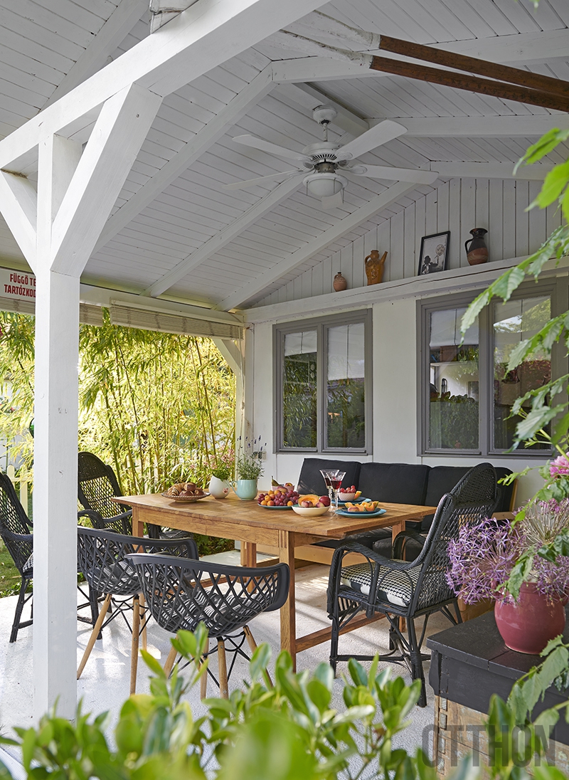 „Valóságos lavinát indított el a felújítás, végül az egész házat felfrissítettük, falakat festettünk, padlót mázoltunk. A fürdőt és a hálókat is teljesen átfazoníroztuk, és kibővítettük a teraszt” – sorolta Krisztina, akinek nem szegte kedvét, hogy időnként akadozott az anyagbeszerzés, hiszen így még inkább építhetett a kreativitására, mi több, ötleteinek kivitelezésébe a barátait is bevonta. Bútoroknak adtak új életet, izgalmas világításmegoldásokat eszeltek ki, és ügyesen vegyítették a retró és modern elemeket. „Mire beköszöntött a nyár, el is készültünk, és mindannyian élvezhetjük a munkánk gyümölcsét. A fiam szokta mondani, hogy állandó szalont tartok fenn Leányfalun. Nem tagadom, ez a gyerekkacajtól, limonádészürcsöléstől és ráérős ücsörgésektől édes élet maga a földi mennyország.” Így szövődnek tovább Krisztináék családi történetei a nyaralóban.