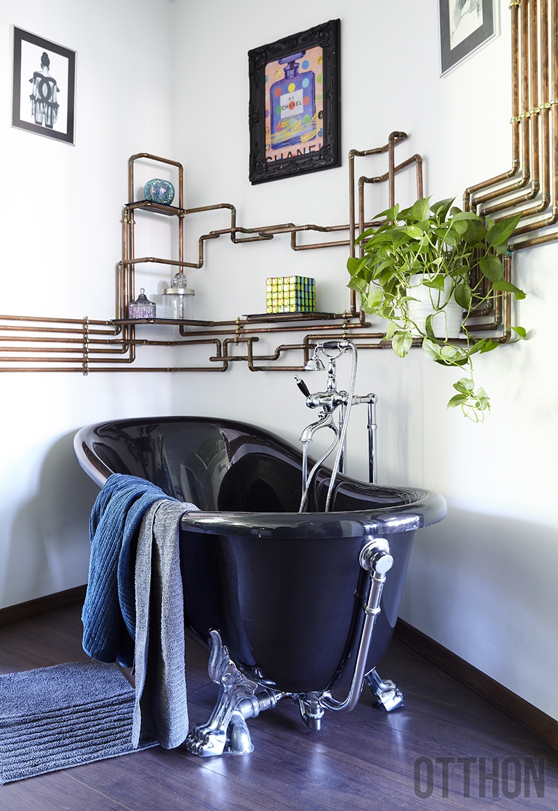 Tovább melengeti a beton hűvösségét a loft több ponton is feltűnő vezérszíne, a lila, amely nem csak a tűzött kanapét uralja, de föltűnik a textíliákon és a kozmopolita hangulatot erősítő kortárs festményeken is. Visszatérő vendég a réz, színében és anyagában egyaránt: végigkísér a lépcsőkorláton, a feketére hangolt konyhában és a falakon játékosan végigfutva a fürdőszobában, ahol a dekorációnak sem utolsó törülközőszárítóban végződik. Utóbbit maga Réka tervezte: „Kacskaringós mintáját előre megrajzoltuk, pici elemeit helyben rakták össze. Nagyon mutatós, funkciója miatt pedig praktikus is. Emellett az utolsó székig minden bútort itthon gyártattam és hazai kereskedőktől szereztem be.” Így vált teljessé a multikulti hangulat, amelyben Réka ugyanúgy szeret megmártózni, mint kedvenc lábas kádjában. Íme, ez a bohém női loft titka.